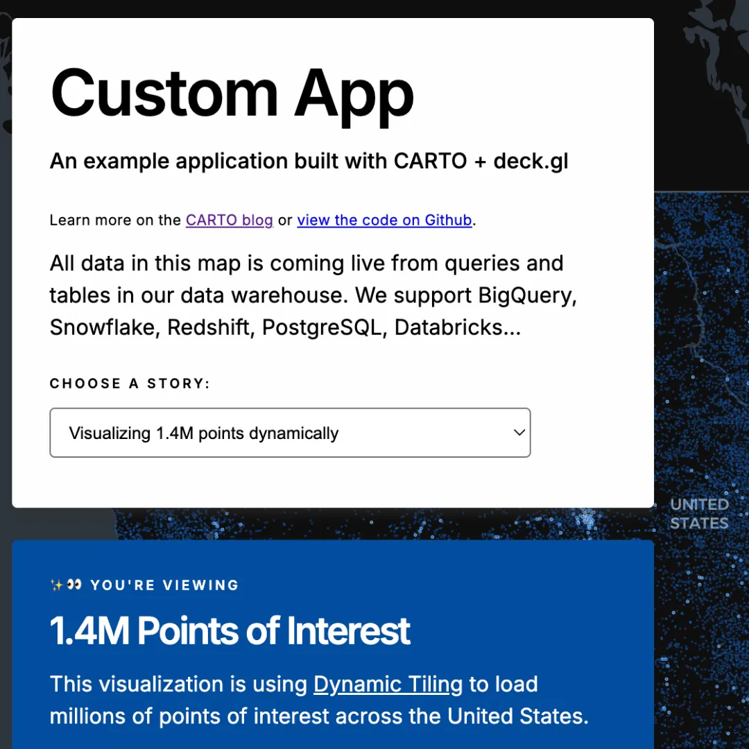 This custom application utilizes CARTO + Deck.gl in a simple Typescript structure, accessing data through a cloud-native data warehouse connection without the need for ETL or replication. Dynamic Tiling allows the user to visualize and seamlessly interact with 1.4 million Points of Interest in the US, while SQL Parameters enable querying directly inside the application.