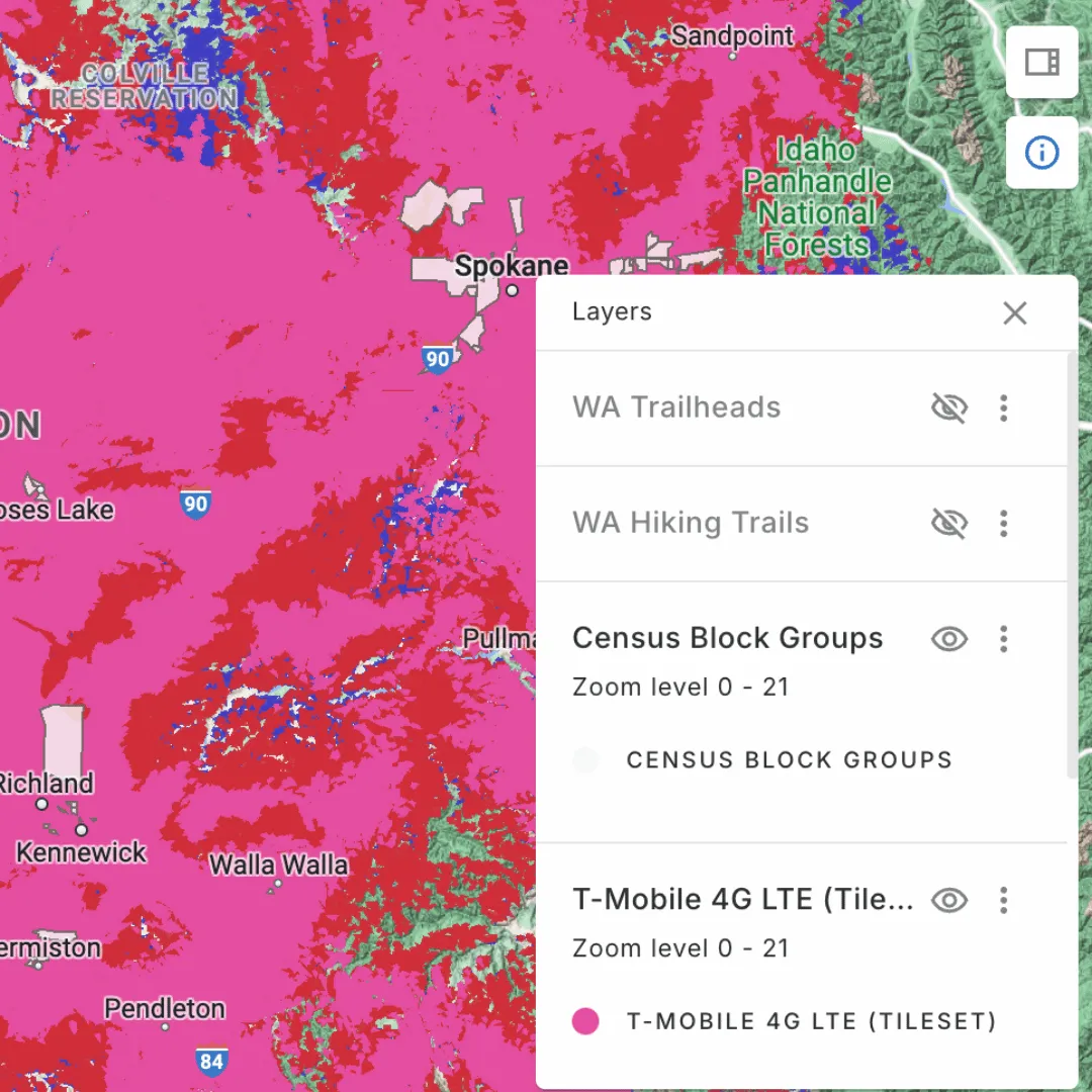 This map allows users to explore 4G LTE coverage for Verizon, T-Mobile, and AT&T in Washington state. The visualization emphasizes gaps in network service in order to inform strategic decisions for telecom providers in addressing connectivity challenges in diverse terrains and identifying opportunities for network deployment.
