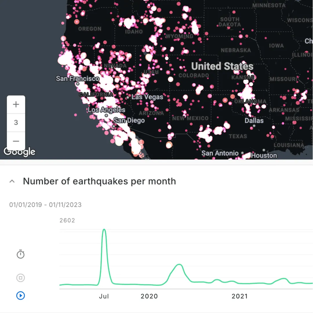The map above (open in full-screen here) visualizes every earthquake in the USA since 2019. You can really see the strong spatial patterns of this hazard, with many more earthquakes occurring to the east of the US around the San Andreas Fault. A key element of this map is the time series widget to enable an animation of these events occurring through time (click play to watch this in action!).