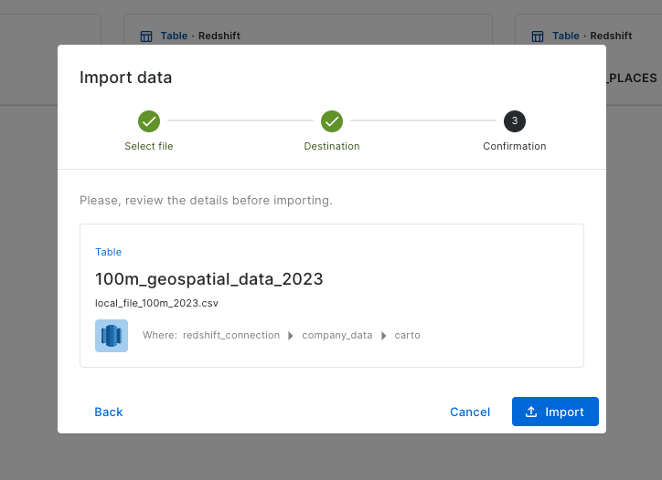 Additionally, users of AWS Redshift now have a new way to import geospatial files to their cluster by leveraging the CARTO Import API. With this new functionality, CARTO users working with Amazon Redshift will be able to quickly get their geospatial data ready for advanced analysis and visualization, from no-code tools like Builder or Workflows to geospatial development libraries such as CARTO for deck.gl.