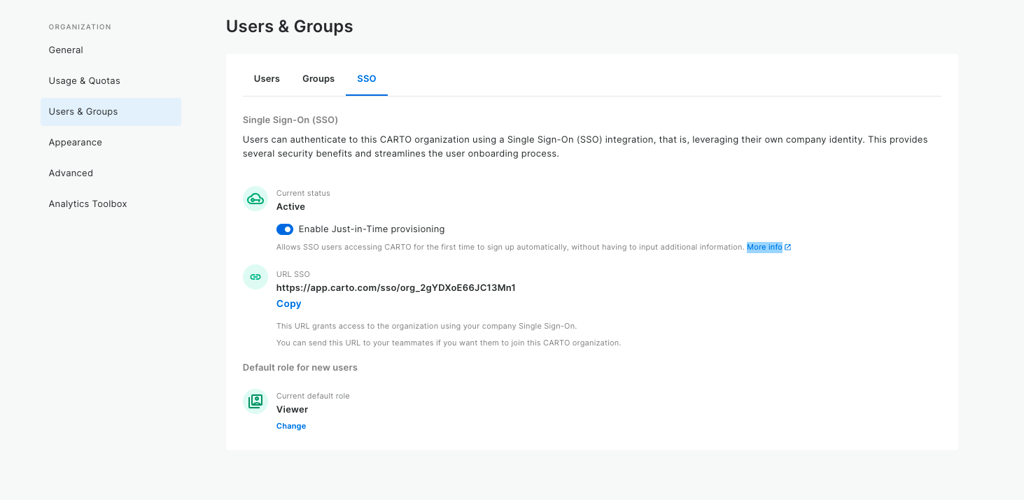 Secondly, admin users of organizations that have their own SSO login can now decide whether new users will get additional questions when onboarding into CARTO or now. If it’s enabled, we will just provision their user as soon as they login, without any extra steps. This new feature has been detailed in the documentation about SSO at CARTO.