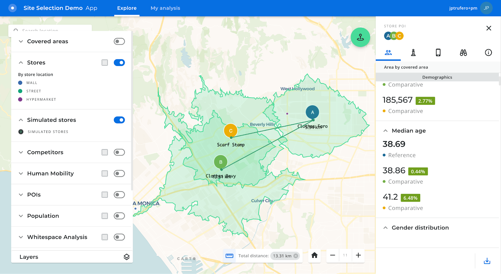 Thanks to a new set of releases, users of our Site Selection application now have access to much richer insights, with a new comparative mode to analyze the trade areas of different stores against each other; and an expandable chart section giving access to more insights based on the available data. We have also added information about the overlapped area between trade areas of different stores (existing and simulated), as a first hint towards potential cannibalization. Benefiting from the scalability improvements of the platform, Twin Area and Whitespace analyses can now be launched at a national level, providing much more powerful insights with greater coverage. Finally, we also added a measurement tool to calculate the distance between existing stores, simulated locations and those of competitors.