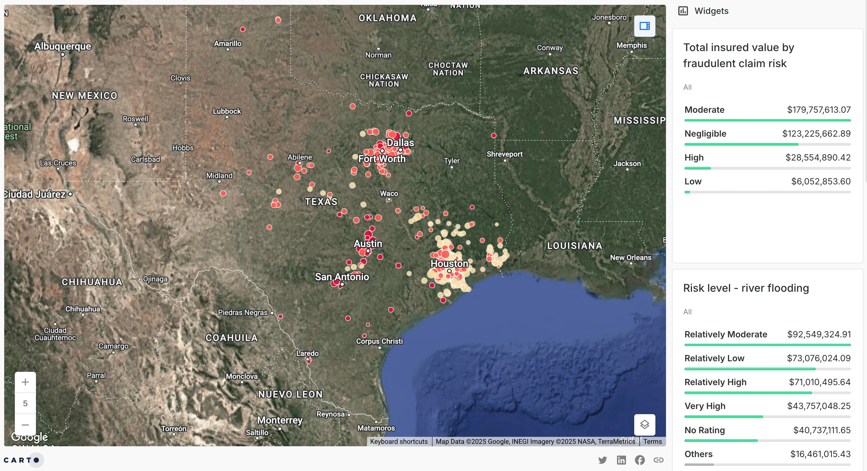 You can explore the results of this analysis in the CARTO Builder map below (or open in full-screen here)! Light yellow assets are ones where the fraud risk is lower, moving up to darker red assets where the risk is higher. The asset pop-ups and dynamic widgets on the right of the map can be used to explore the results - and the factors which have been driving them - in further detail.