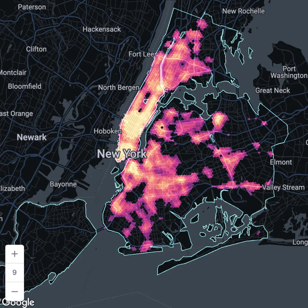Secondly, you’ll need a dataset which you want to investigate! Any dataset with both space and time dimensions will work. In this example, we’ll be looking at spatial-temporal trends in the 1.8 million vehicle collisions which occurred in New York City from 2012-present (visualized in the map below, or open in full screen here). We’ll be investigating whether certain parts of the city experience more vehicle collisions at certain times of the day. This example is helpful for use cases such as transport planning or urban design.