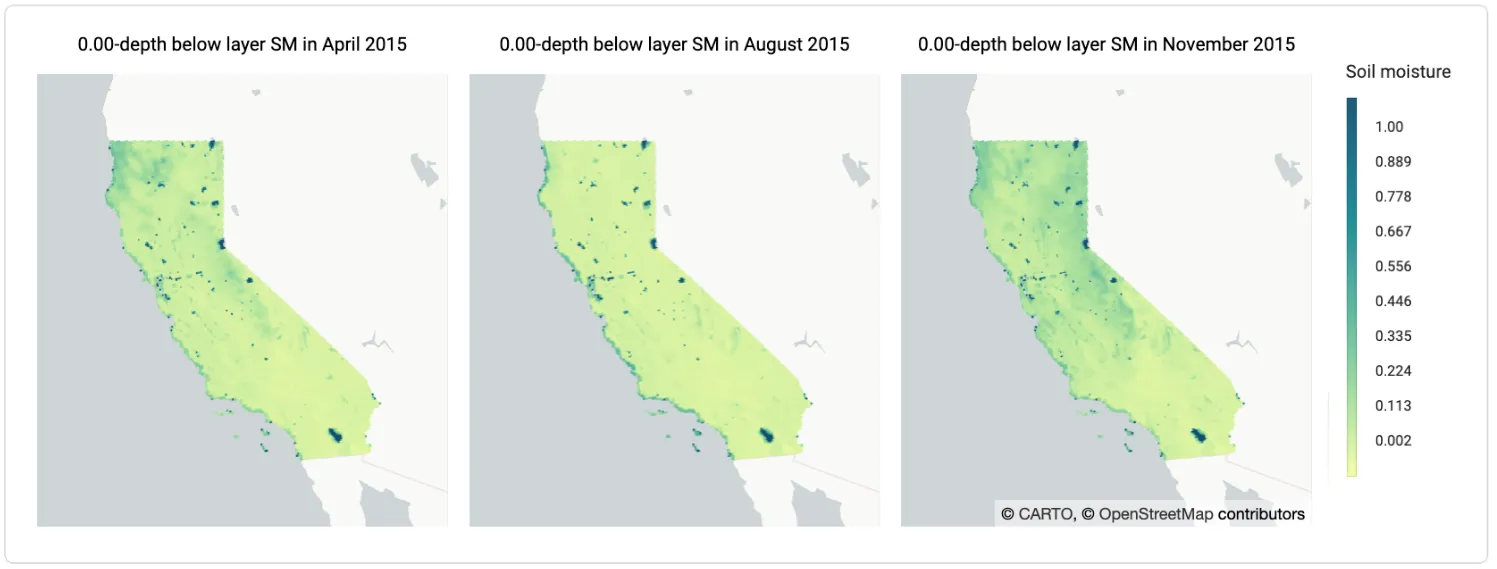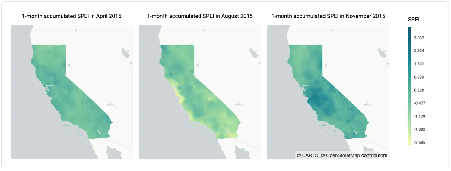 If we select other seasons in the previous map, we can see that for 2020 colder seasons (Winter and Spring) it shows lower risk than previous years, whereas during hot drier seasons (Summer and Fall) the risk of wildfires increases significantly. It is also noticeable that the WRI in Fall appears to be VH in most cases. This occurs because during these months the forecasted 2020 SPEI values are much lower than those used to define the index (2001-2019) indicating that the 2020 Fall season is much drier than average explaining the elevated risk of ignition as can be also seen in these figures: