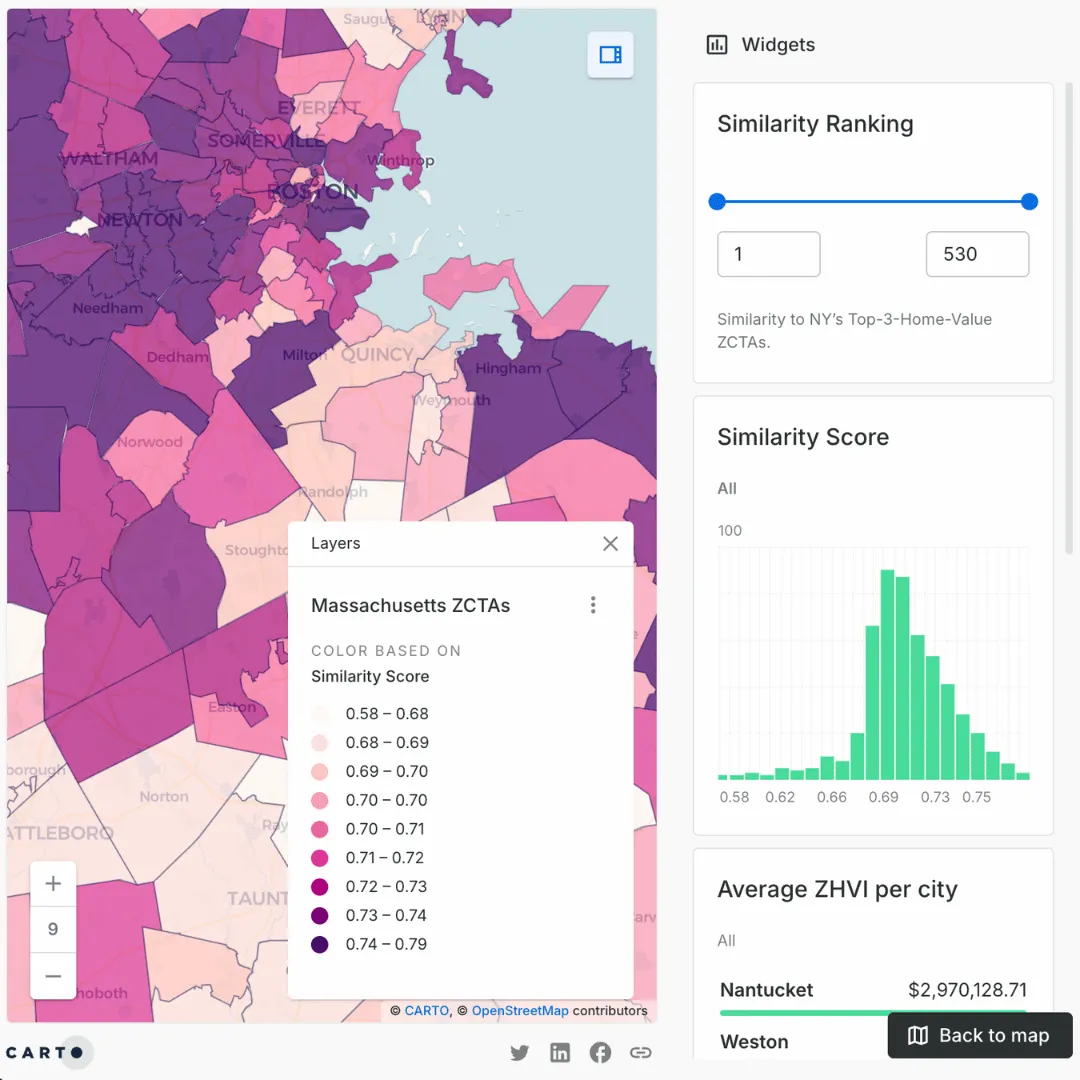 To put this to the test, we applied the Similarity Search component using ZCTAs PDFMs to analyze high-value locations across states. Our goal was to find comparable locations in Massachusetts with the three most valuable ZCTAs in New York—based on Zillow’s House Value Index, which are located within Suffolk County, a well-known, wealthy, and highly desirable real estate market, with luxury coastal properties in the Hamptons attracting affluent buyers and investors.