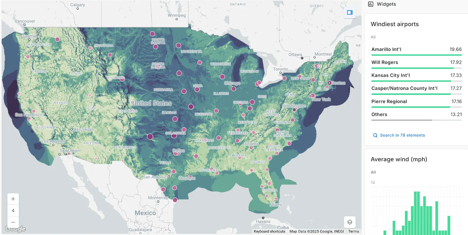CARTO Builder automatically adapts to your raster's metadata and ensures seamless visualization, even excluding "No Data" pixels for cleaner results. As with vector layers, you also have full control over opacity, zoom level visibility, layer blending and interactions.