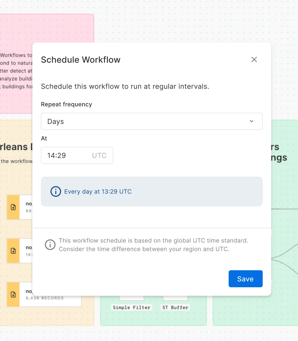 Spatial workflows are often siloed and manual, making automation and integration a challenge. Use Workflows to automate, schedule & trigger analysis - seamlessly embedding processes into your broader infrastructure.