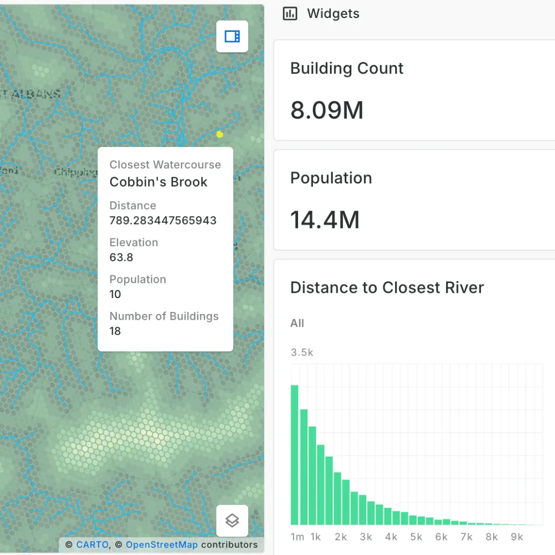 This map (explore in full-screen here) explores flood risk across Britain. The population, number of buildings, elevation and distance to water courses have been calculated for each of the 362,627 H3 cells on this map. Zoom-based rendering means more detail - such as 40.4 million individual buildings - appears as you zoom in, making this a great tool for decision-making at local to national scales.