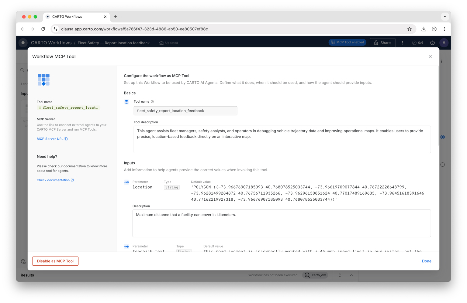 Each MCP tool is powered by a workflow in CARTO—a visual pipeline that defines exactly how the spatial analysis is performed. Instead of unreadable complex queries, this brings transparency, maintainability, collaboration, and version control to the tools that you’re exposing via MCP.