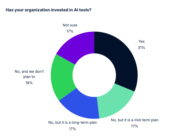 According to the survey, 31% of organizations have invested in AI tools, a figure that has stabilized since 2024. At the same time, the share of organizations with no plans to adopt AI has grown to nearly 18%, highlighting a widening gap between early and late adopters.
