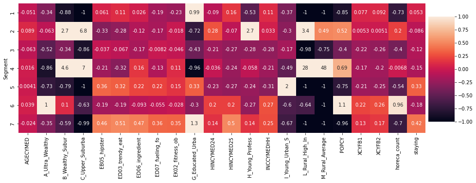 You can see in the heatmap below the characteristics of each segment in a more visual format. A cell represents the value of the feature (horizontal axis) for a Segment (vertical axis). This value is the percentage difference between the average value for that segment and the global average value.