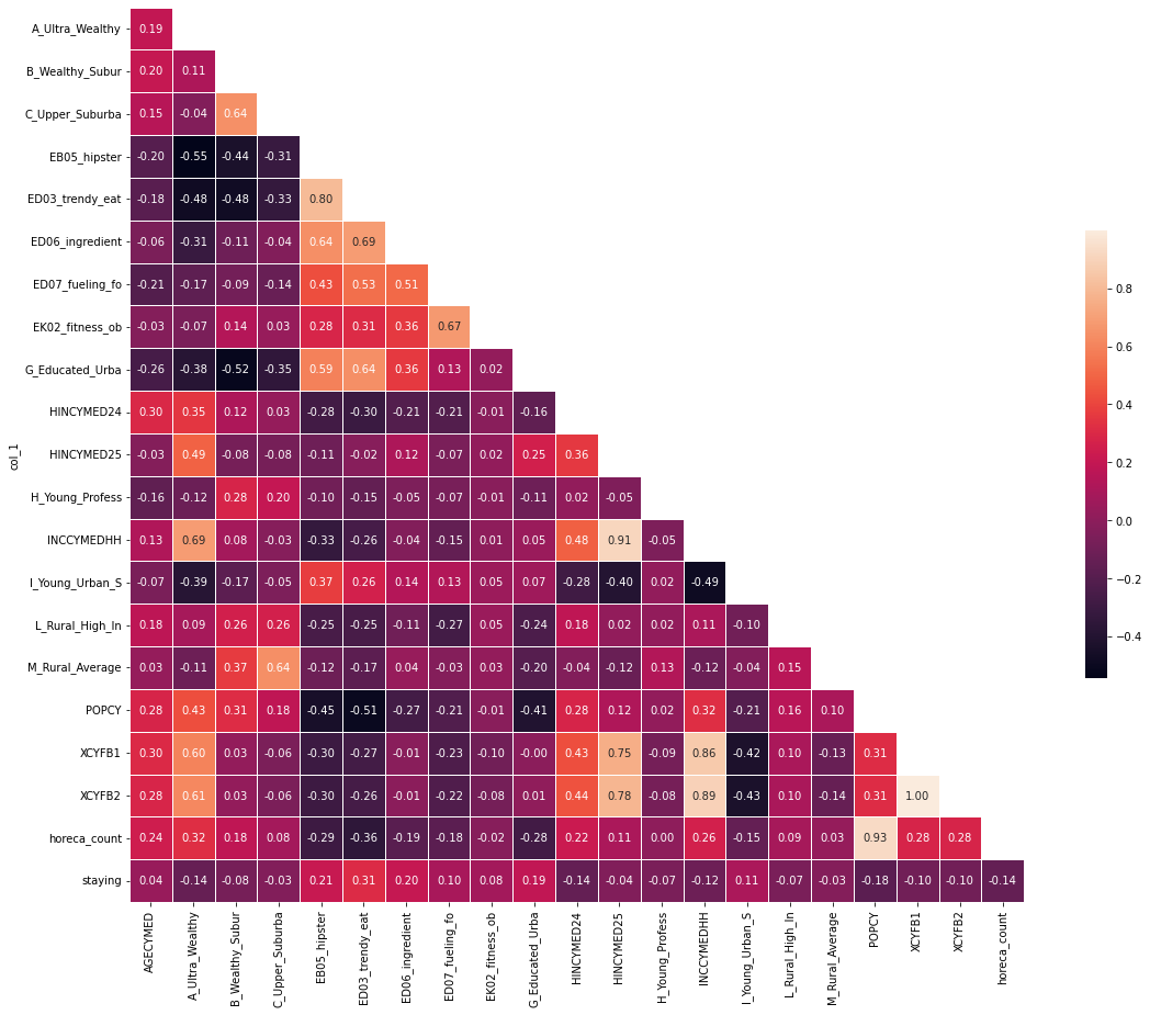 After the enrichment  we used the correlation analysis table to understand the relationship between all pairs of features. In the diagram below  we can see that very few features are correlated with each other. The one relationship that stands out the most is the relationship between average median income and the household expenditure in food away/home. In addition  the total population correlates with the number of HORECA (Hotels  Restaurants  Cafeterias) stores. From a business perspective  these relationships make sense  the higher a household income is  the more it can spend on food; while for the second  more densely populated areas are likely to have more restaurants  cafeterias  etc.