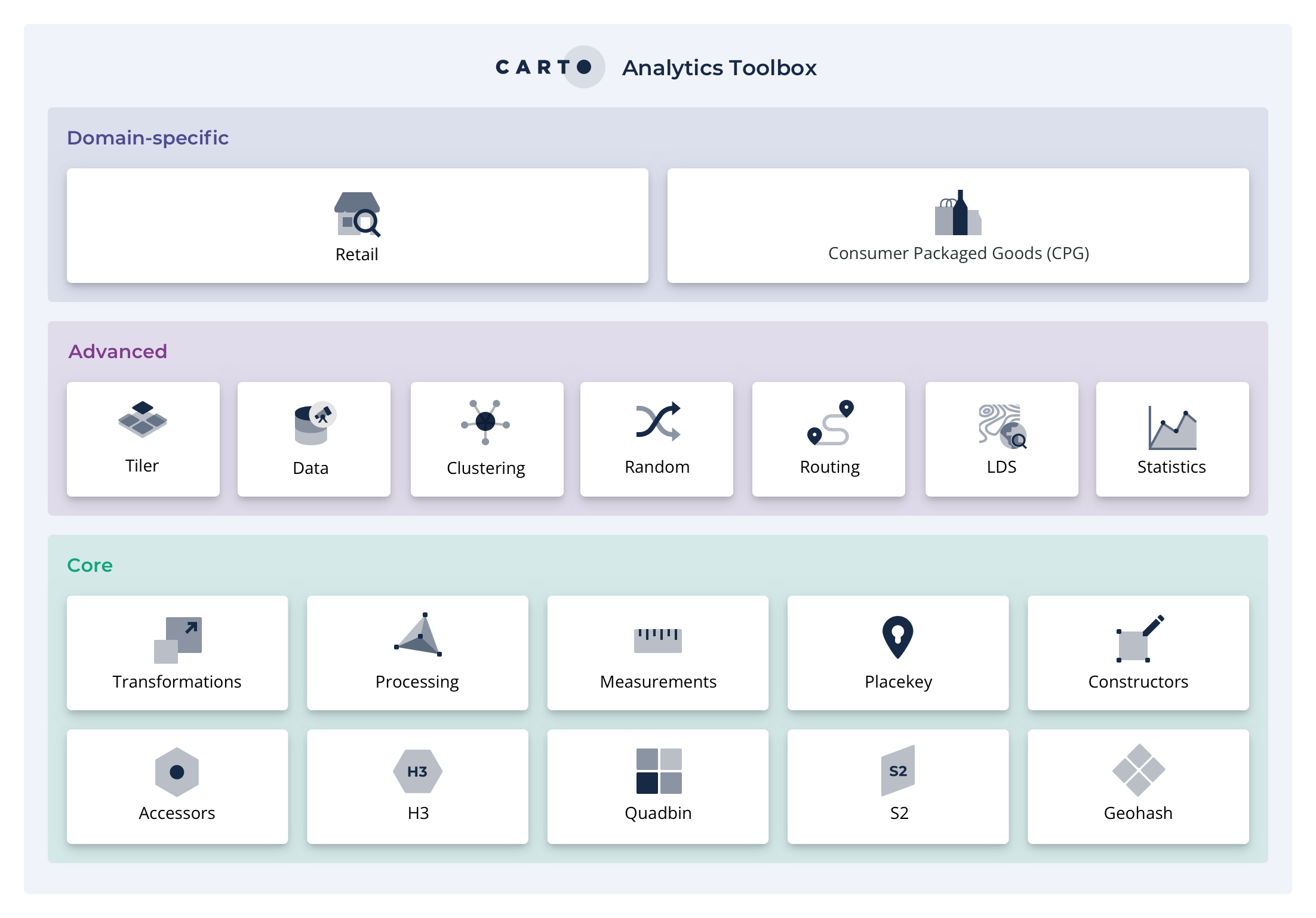 The analysis routines in the Analytics Toolbox cover a broad range of spatial analytics use cases and are organized into a series of modules (data  clustering  statistics  etc.) based on the functionality that they offer. Today  we are happy to announce the availability of a new domain-specific module to solve geospatial analytics for the CPG / FMCG sector  starting with  Customer Segmentation.