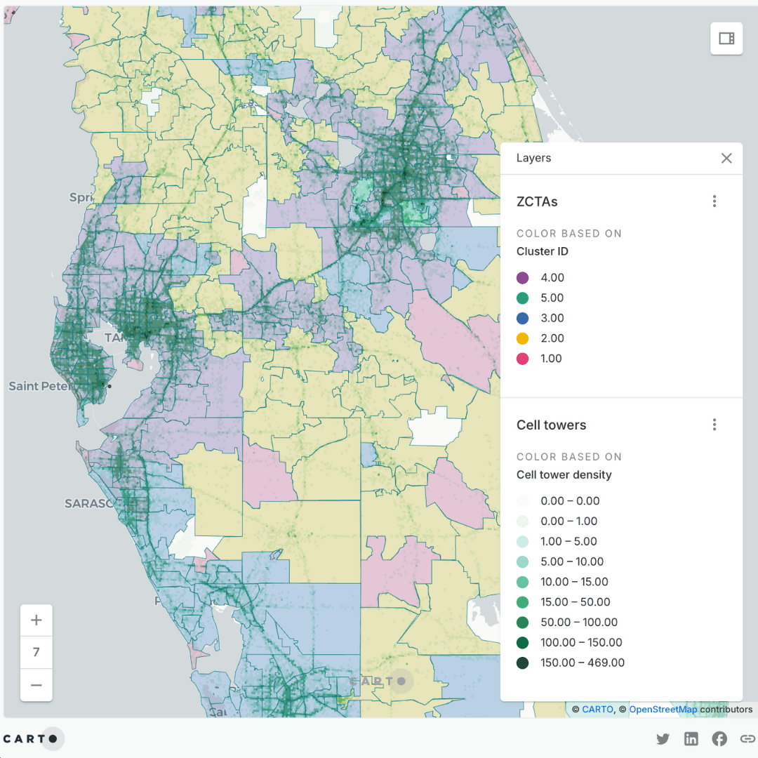For example, using the Clustering component alongside Google’s ZCTAs PDFM Embeddings, organizations can quickly identify network and service gaps. By comparing areas clustered by similar mobility patterns and analyzing their cell-tower density, clear differences emerge: